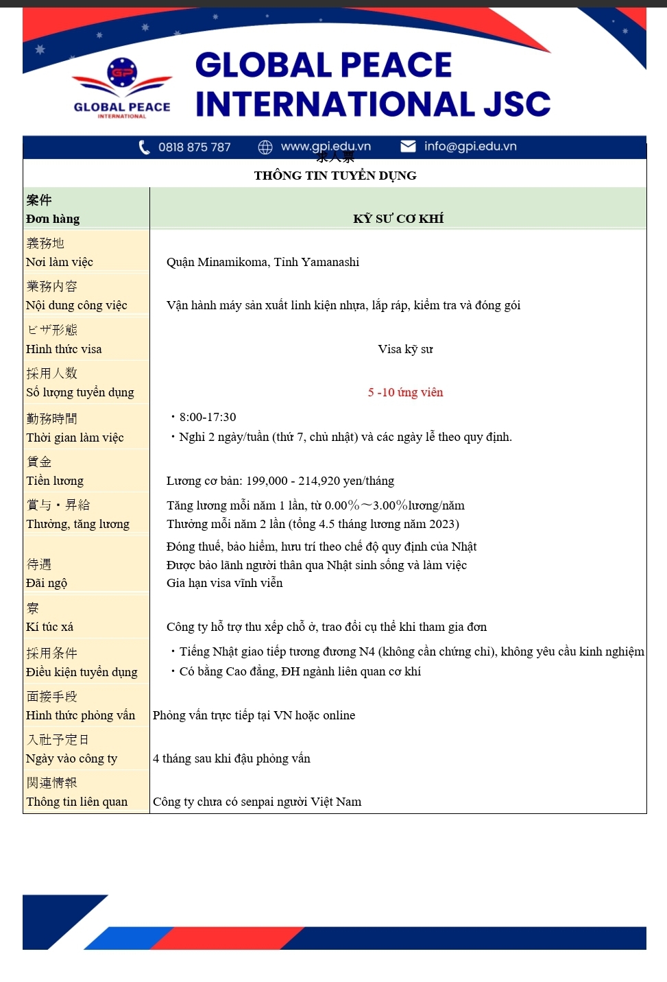 ĐƠN HÀNG KỸ SƯ CƠ KHÍ NHẬT BẢN - MINAMIKOMA
