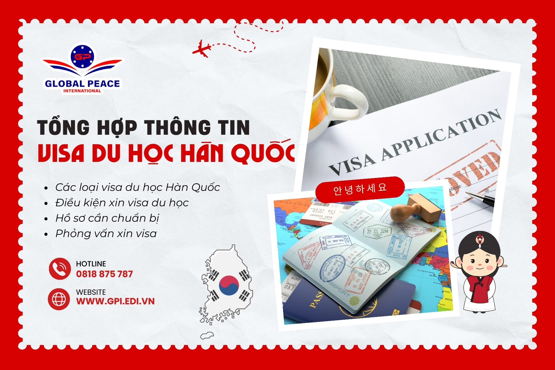 Tóm lại, Visa du học Hàn Quốc giúp đảm bảo sự hợp pháp cho các du học sinh yên tâm học tập. Nếu bạn quan tâm về vấn đề “Xin visa du học Hàn Quốc có thật sự khó?” hoặc về du học thì hãy liên hệ Global Peace International ngay chúng tôi sẽ giải đáp chi tiết cho các bạn!