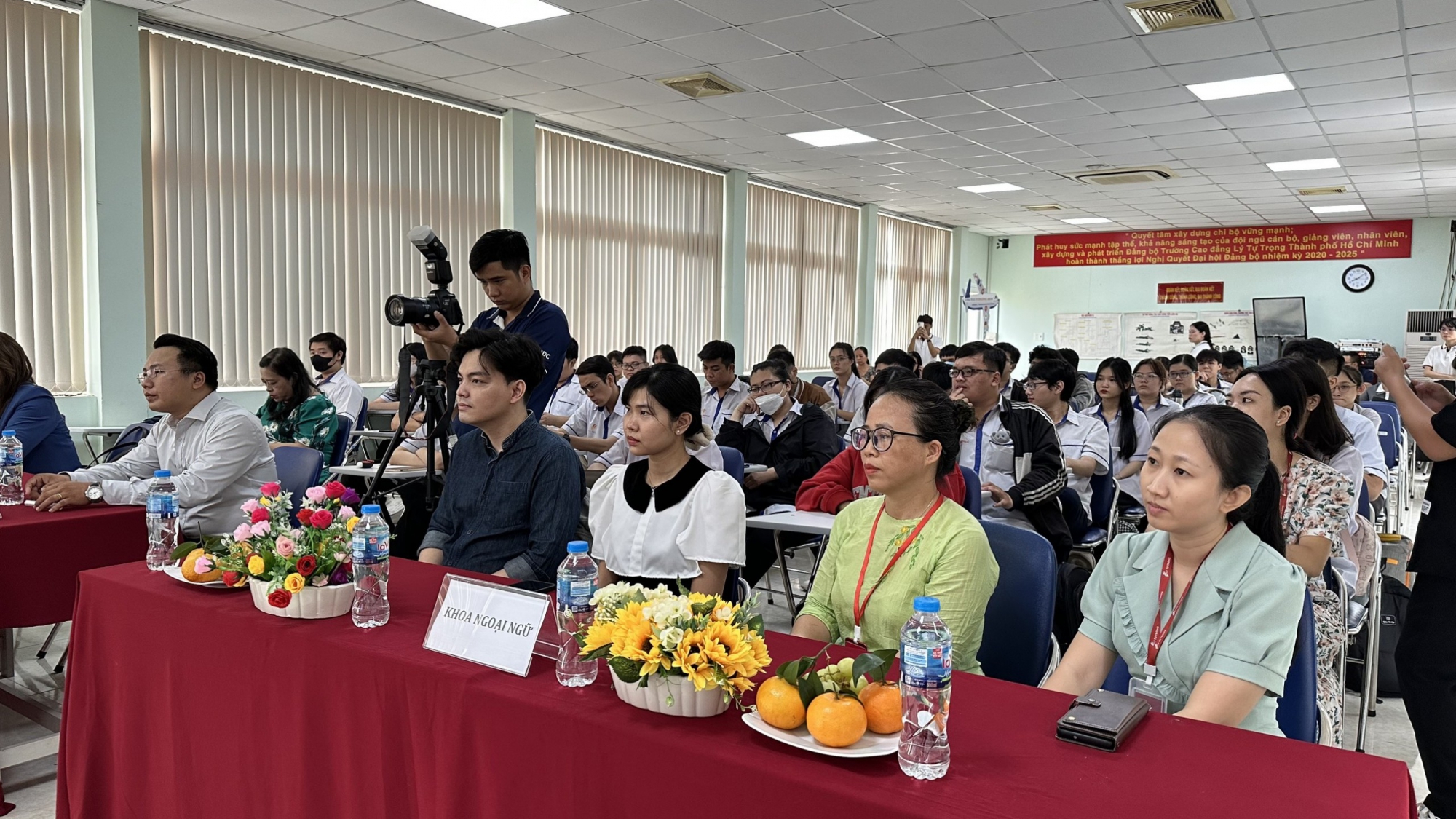 Cô Nguyễn Thị Thu Hà - Trưởng khoa Ngoại ngữ, cùng các thầy cô và gần 100 sinh viên của Khoa Ngoại ngữ trường CĐ Lý Tự Trọng